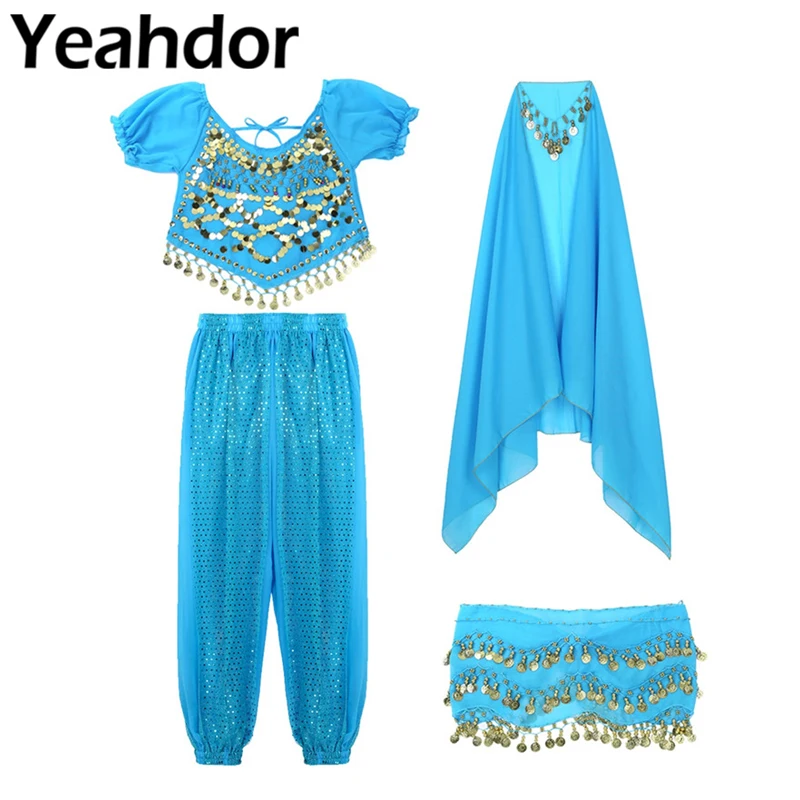 - Frauen Indien Dance Outfit Kurzen Laternen Ärmeln Münzen Top Harem Hosen Hüfte Schal Kopf Schal Karneval Bauchtanz Kostüme Set