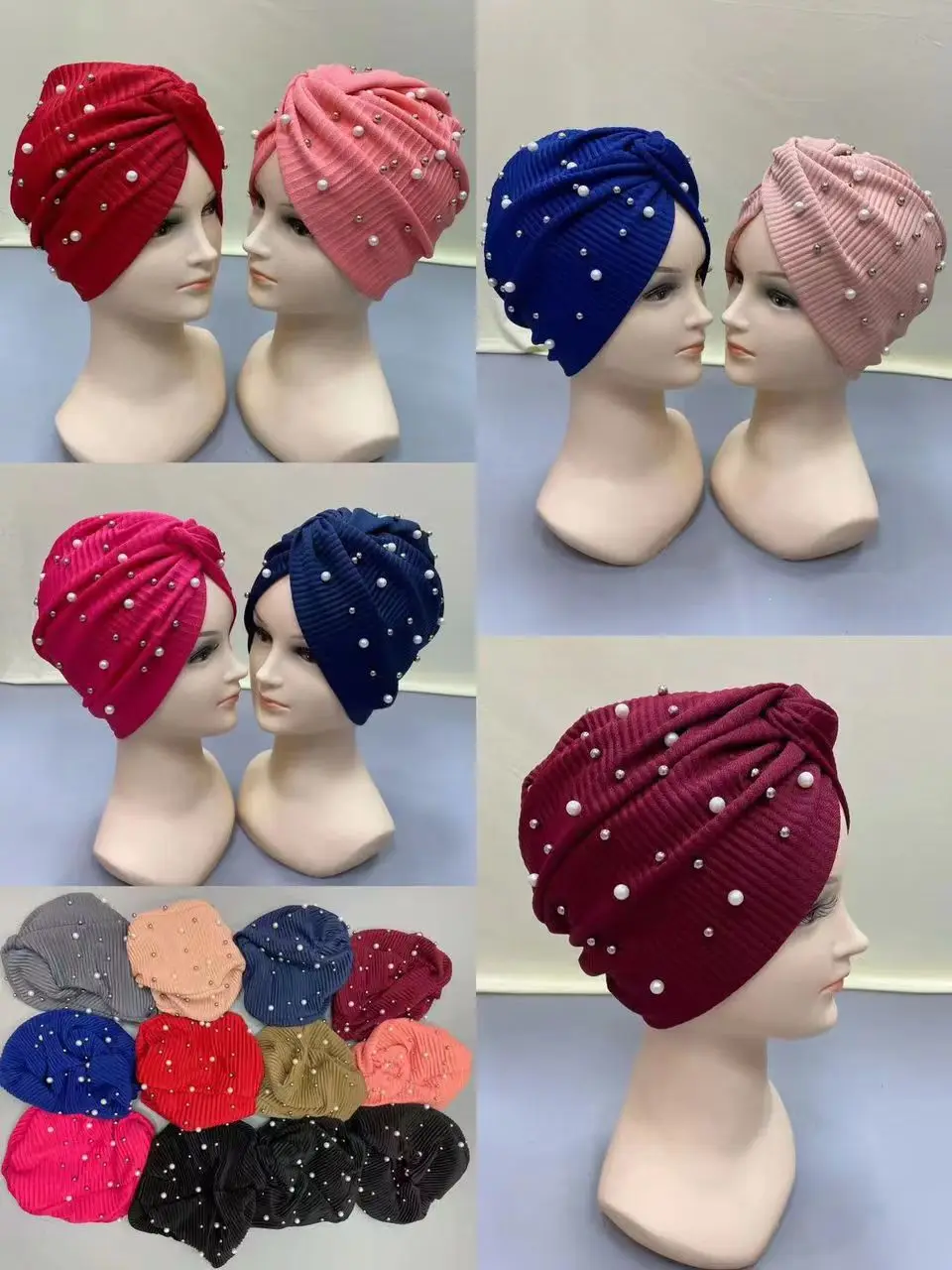 - Großhandel 12 stücke Neueste Ziemlich Turban Hüte Frauen Cap Perlen Für Indien Hut Schals Kopf Wrap Stirnband Mädchen Haar Zubehör dame
