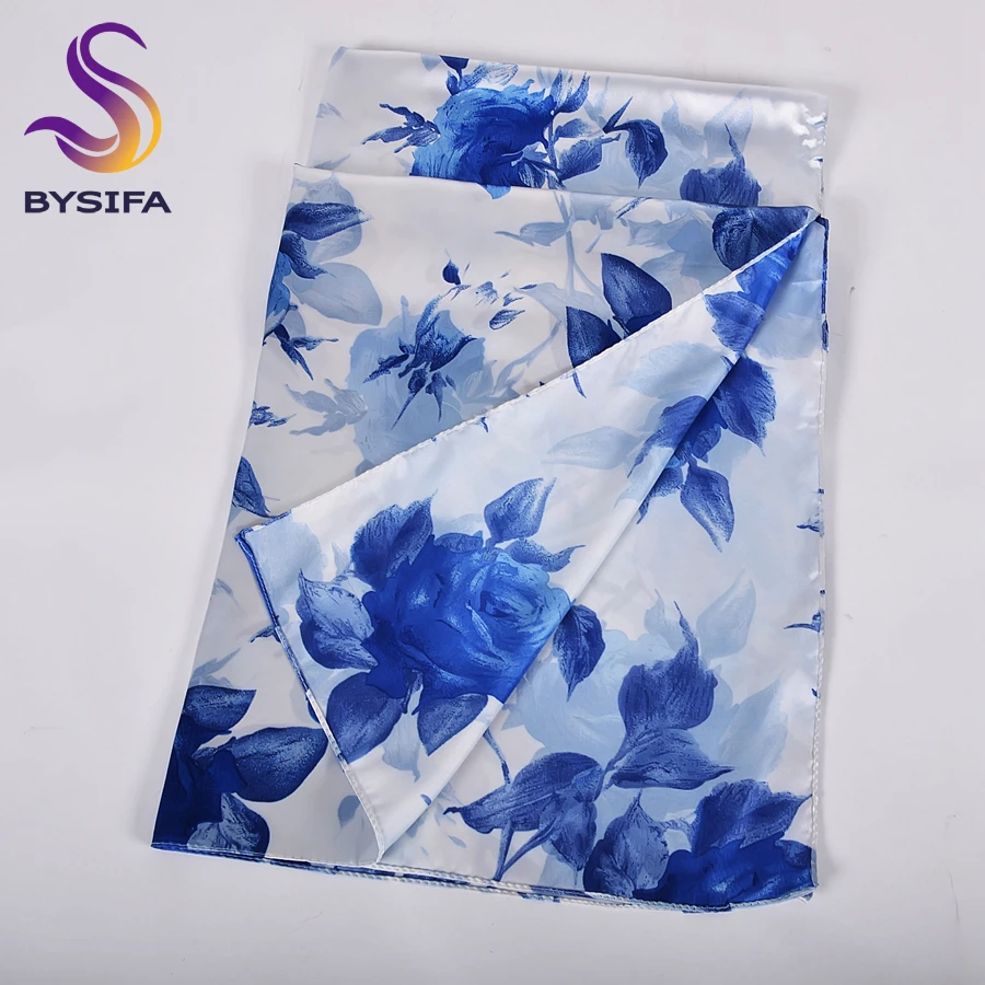 - [BYSIFA] Blau Weiß Rosen Frauen Silk Schal Cape 2020 Neue Frühling Satin Lange Schals Wraps Elegante Damen Kopf schal 160*70cm