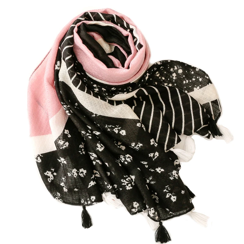 - 2022 mode Streifen Muster Quaste Schal Schals Weichen Baumwolle Lange Kleine Blume Muster Kopf Wrap Hijab Schals Freies Verschiffen