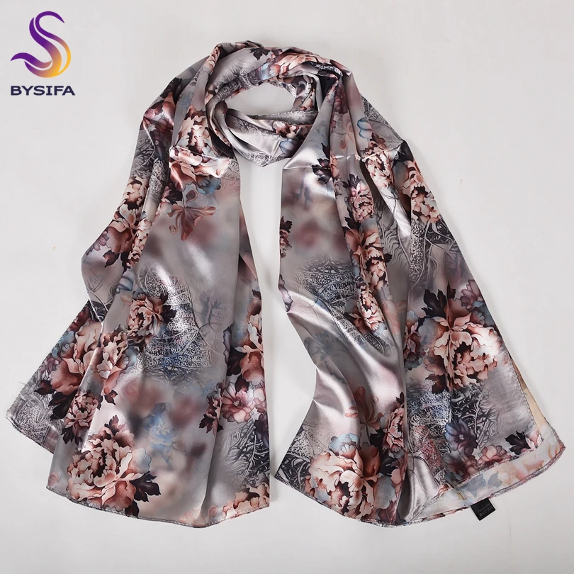 - [BYSIFA] Grau Rosa Pfingstrose Frauen Satin Lange Silk Schal Schal Chinesischen Stil Schals Gedruckt Herbst Winter Weiblichen Kopf schal 160*70cm